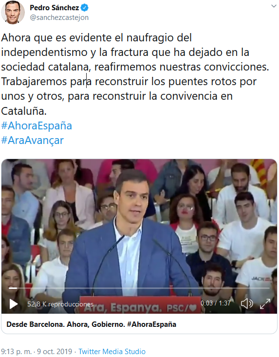 Dice Pedro Sánchez, con un oportuno subtítulo del PSC, que ahora toca reconstruir los puentes rotos por unos y otros [¿estará de acuerdo con eso Marchena o solo condenará a unos?]. Que es tiempo de reconstruir la convivencia en Cataluña.