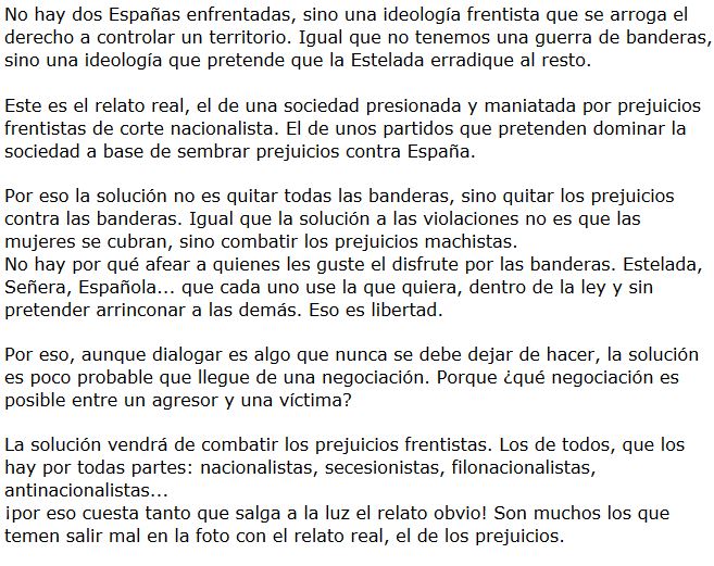 Al mismo tiempo, en Cataluña, la estrategia nacionalista del Procés ha sacado a la luz pública las facetas más antidemocráticas del nacionalismo: imposición lingüística, adoctrinamiento escolar, marcado ideológico del territorio, utilización partidista de las instituciones públicas (incluyendo malversación), ilegalidades (llegando a la sedición), permisividad ante el delito y apoyo a los afines que delinquen…