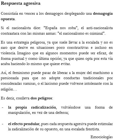 Actualmente se ve su discurso, emocionalmente agresivo, se percibe como la respuesta a una agresión. Y de ahí que muchos lo acepten. Pero a medio plazo acabará siendo tan negativo como el original.