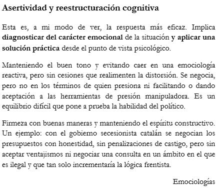 El juego de devolver golpe por golpe no funciona a medio plazo. No resuelve. Así que convendría buscar un nuevo tipo de respuesta. Y creo que el PP de Casado, Cayetana Álvarez de Toledo, o Alejandro Fernández, lo cumple. Una respuesta asertiva. Con una firmeza que no cede a las presiones, acompañado de una denuncia de la manipulación que suponen (reestructuración cognitiva). Y todo sin agresividad.