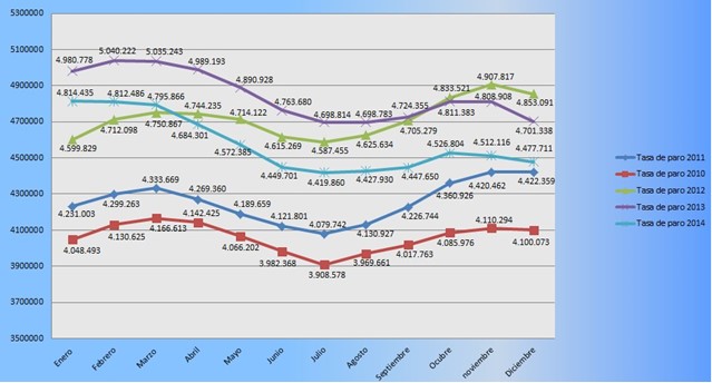En el periodo de 2010 – 2013 mejoró la situación. Por igual para toda la sociedad. La línea es casi paralela a la anterior pero desplazada hacia arriba. La primera mitad del periodo gobernaba el PSOE (Zapatero) la segunda el PP (Rajoy), así que no se pueden valorar sus efectos por separado.