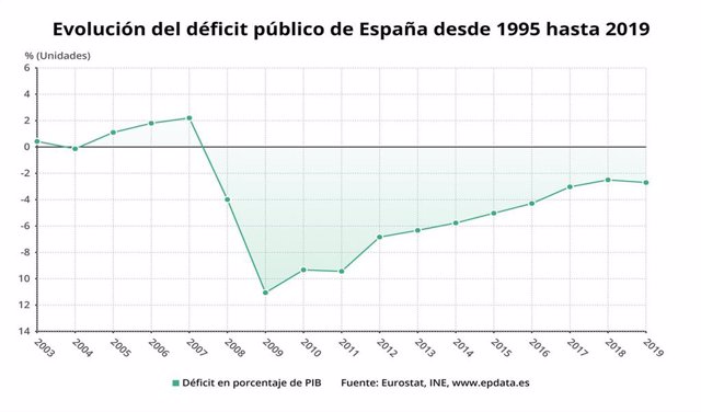 P.D.2 (3 mayo 2021) Una gráfica que muestra la evolución del déficit público español con Sánchez antes de la pandemia. Puede verse que el 2019 ya había dejado de reducirse e incluso aumentó. Invirtiéndose la tendencia de recuperación, como con el paro.
