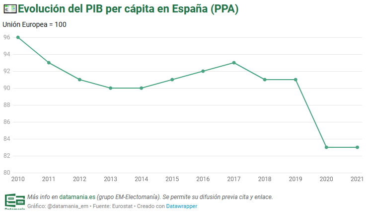 Decreciente con Zapatero (5% de caída sólo desde 2010), se compensa un poco durante la etapa de Rajoy (frena la caída y sube en total un 20% entre 2012-2017) y vuelve a caer fuertemente durante la etapa de Sánchez (lleva ya una caída del 10% desde que entró en 2018). Y es en valor relativo respecto de la media europea, es decir, no es achacable a las distintas crisis globales ya que todos los países las han sufrido. En total, Zapatero y Sánchez nos han hecho a todos los españoles un 15% o 20% más pobres, con todo lo que eso implica.