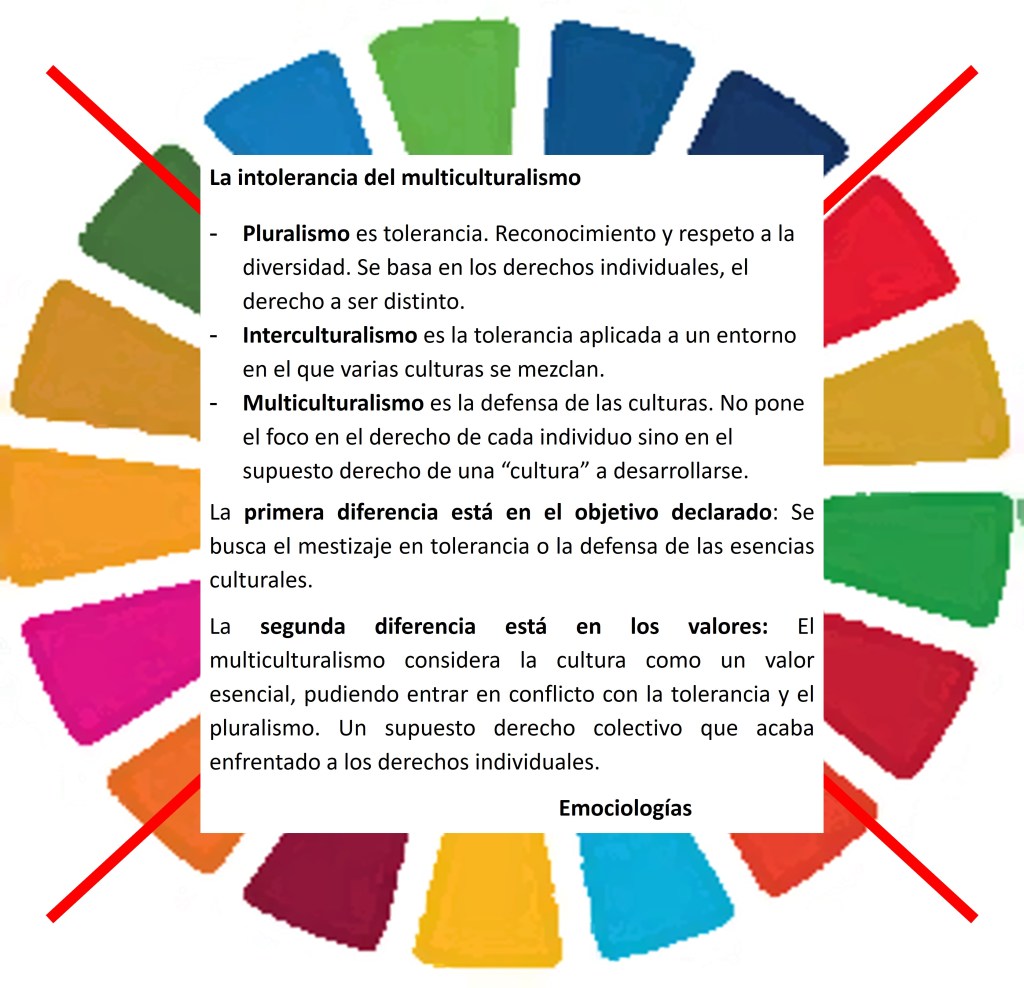 La promoción del multiculturalismo, algo más sutil, paro también una perversión intelectual. Una herramienta de manipulación para hacer creer a la gente que para ser bueno hay que ser tolerantes con los distintos aunque hagan el mal. Una trampa similar a la del nacionalismo, anteponiendo la defensa de un supuesto bien cultural colectivo a la defensa de los derechos individuales de quienes forman el colectivo. Una ideología perversa que supedita los derechos de los individuos a unos supuestos derechos de las culturas, en vez de al revés.