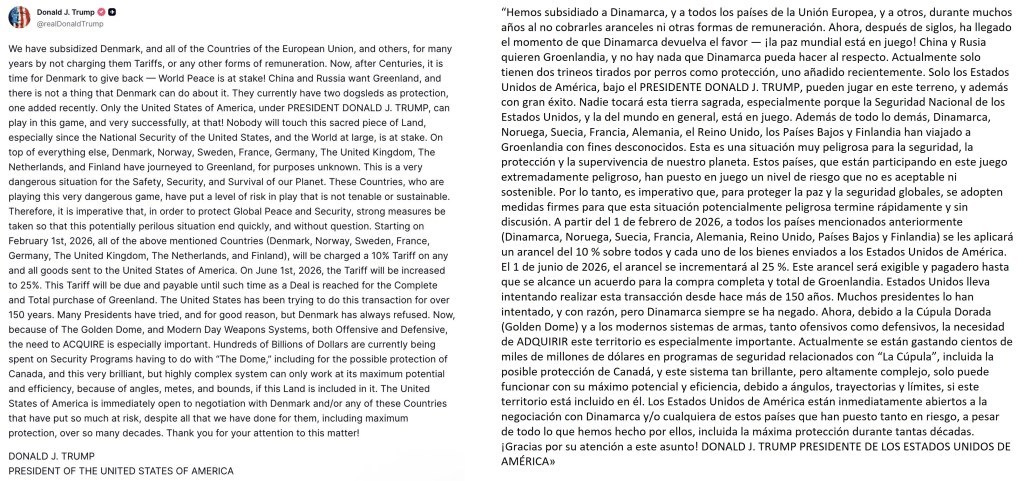 Para analizar lo de Groenlandia también hay que tener en cuenta todo lo anterior ¿Puede Trump confiar la seguridad de EEUU a la alianza atlántica? Parece evidente que no, que le dejarán en la estacada en cuanto tenga necesidad. Y Groenlandia, por lo que dice, que yo no soy capaz de valorar, es esencial para la seguridad de EEUU.